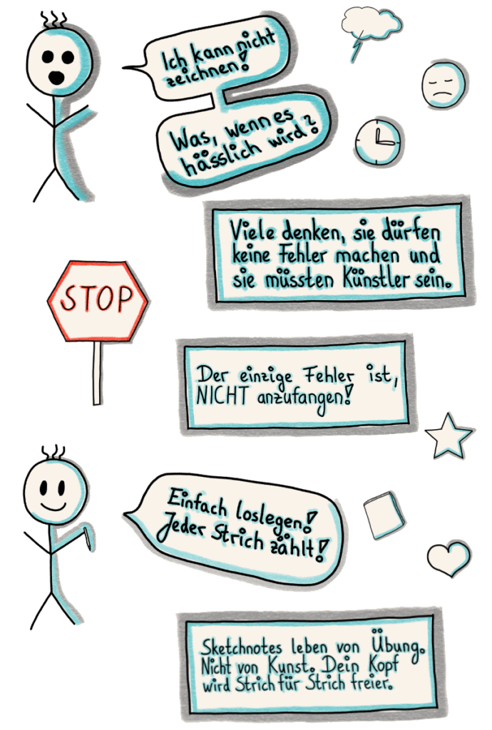Du brauchst kein riesiges Zeichentalent. Es geht dabei nicht um Kunst, sondern um Wirkung. Sketchnotes helfen, komplexe Themen verständlich zu erklären und schnell zu erfassen. Durch die Kombination von Wort und Bild kann unser Gehirn Informationen besser verarbeiten.