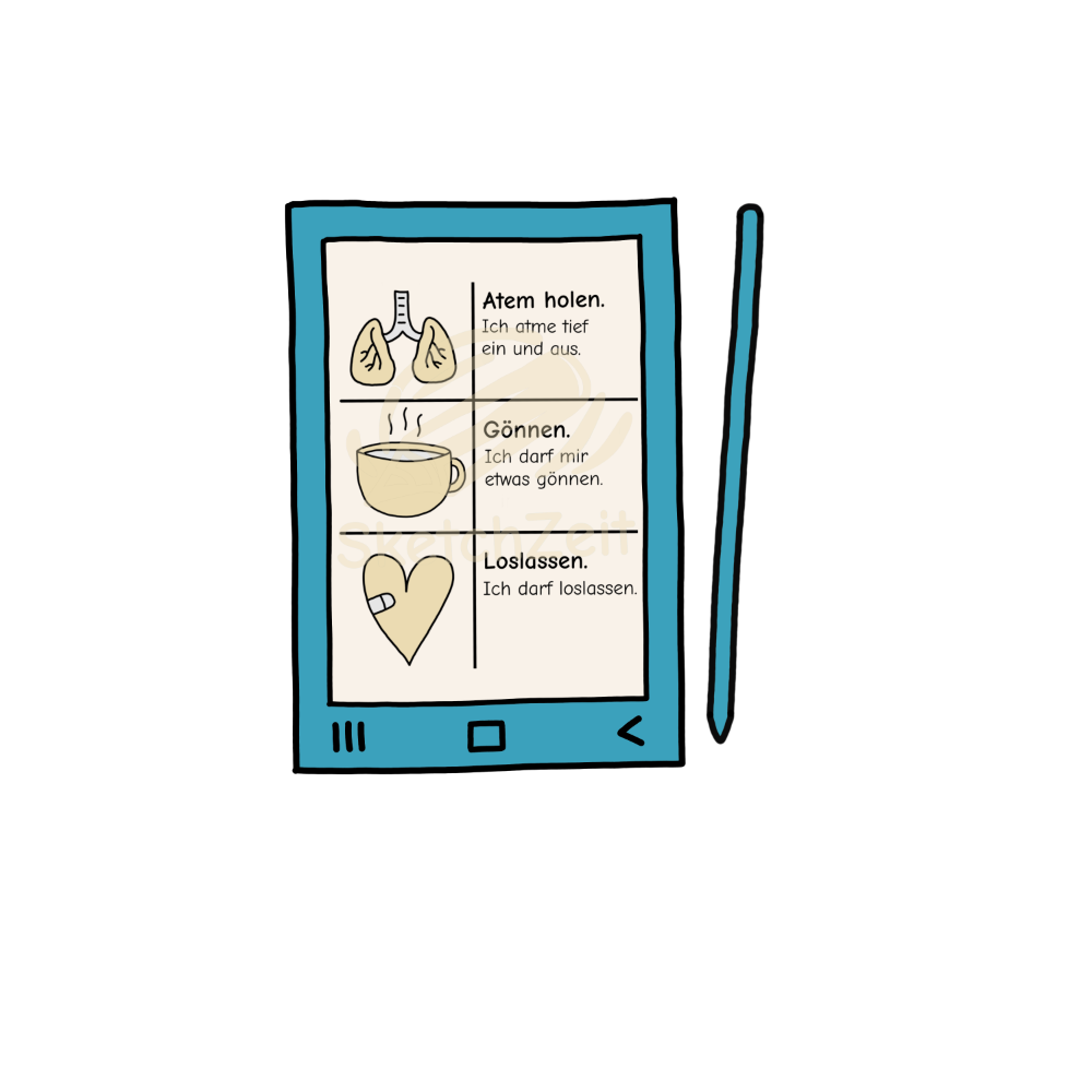 Du bekommst 2 Seiten im Sketchnote-Stil mit Impulsen und kleinen Wohlfühlmomenten.